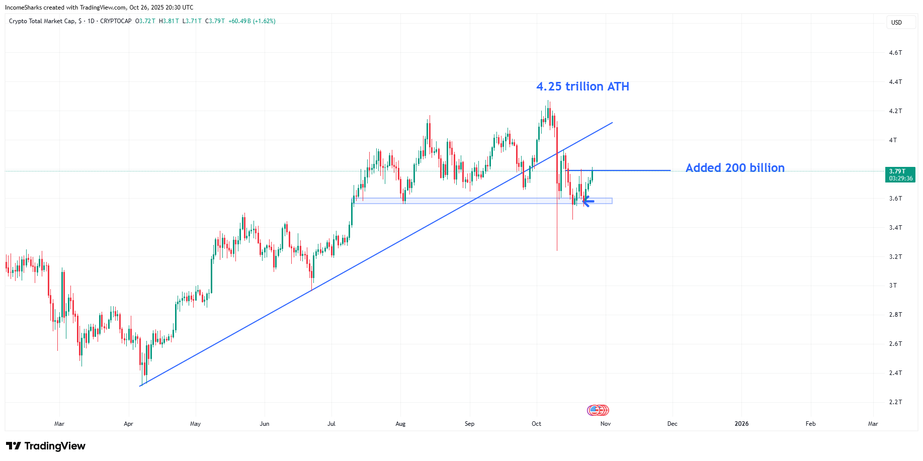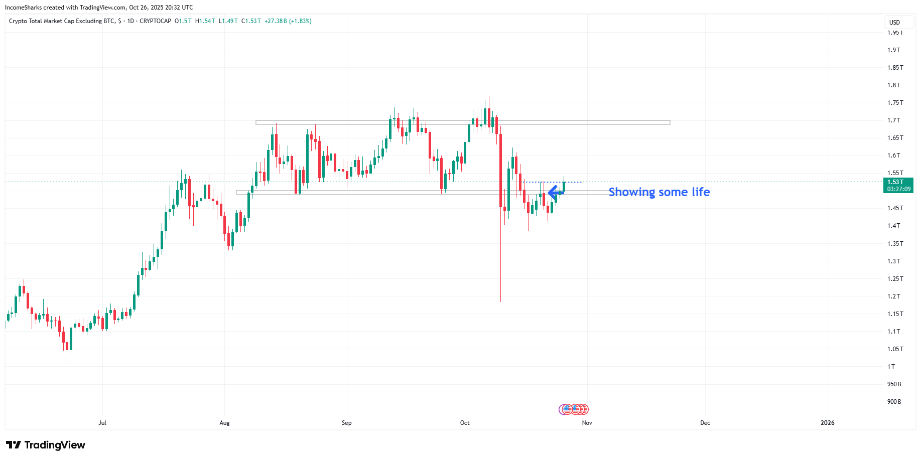 Opinion: The crypto space is steal trying to get its footing back after the cascade of liquidations and sentiment has remained relatively low. It seems more than logical to be cautious here but although the pendulum hasn’t quite swung back yet the conditions are slightly improving and think many are optimistic for November to deliver as a historically bullish month for crypto. A perfect scenario would be stocks slowing down while staying somewhat bullish and crypto having a month where it can gain back the attention.