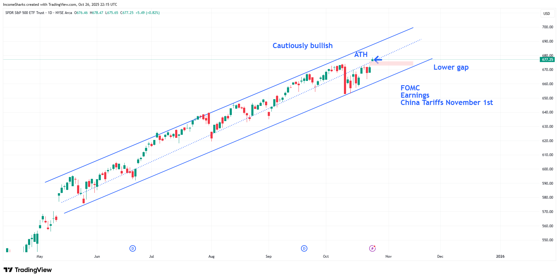 This week definitely more eventful than past ones. We have FOMC and rate decisions this week, China Tariffs on November 1st (look to see a pause/extension), and a big week of earnings on some popular stocks.