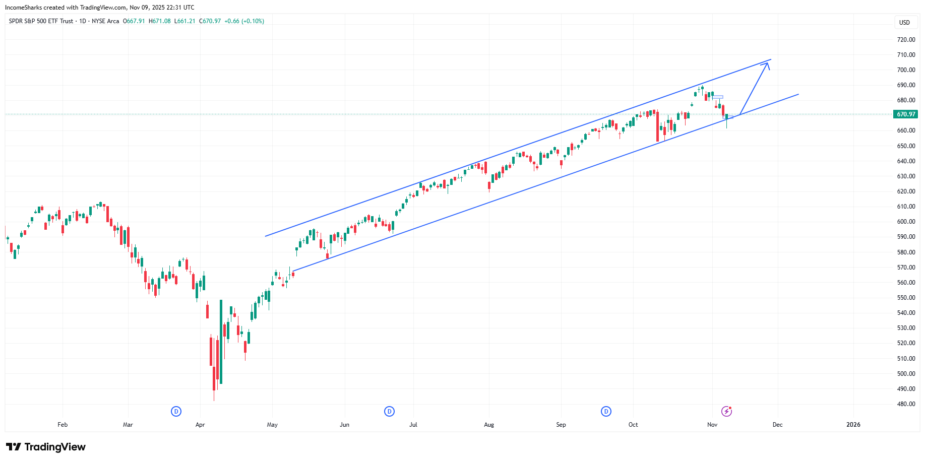 First week in a while where we saw a lot more selling than buying. There was some bad October job data and then some effects of the government shutdown are starting to show. Historically though a week like this after the S&P 500 makes a new all time high isn’t that unusual and sure enough we saw about a 4% drop before momentum returned. Talks of a $2,000 tariff stimulus seems to be moving crypto and might have some positive effects on stock next week. The government resuming and opening back up might also help be a catalyst to see us go to the top of the channel.