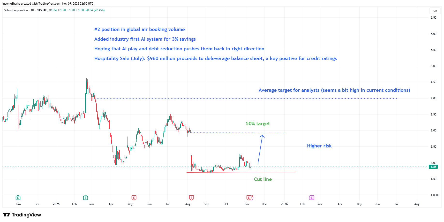 Higher risk play but hoping their new AI investment and Hospitality sale helps with debt issues. Higher risk higher reward if they can get things moving and not a bad setup with 10% downside risk being the cut line. If this support holds there are still analysts giving it a $4 buy rating but I’m aiming for 50% upside at around $3 which fills the gap.