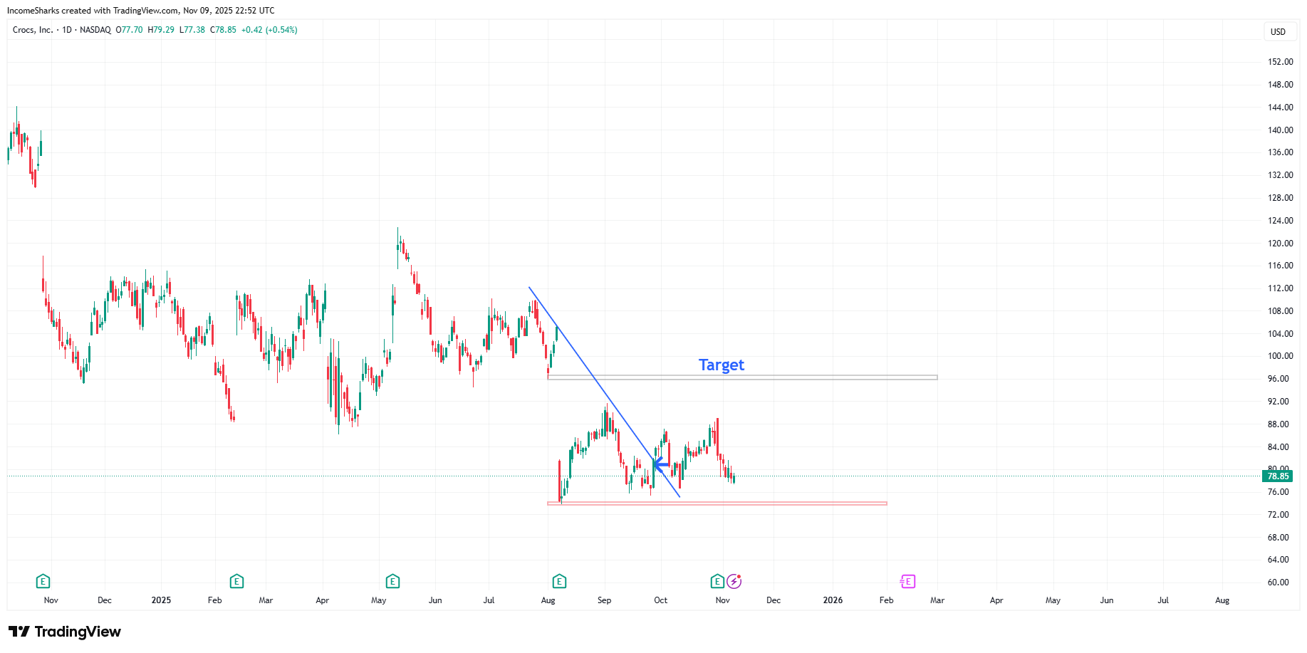 $CROX ( ▲ 0.12% ) (Crocs) - Still holding. Red line is where I cut, target is where I sell.