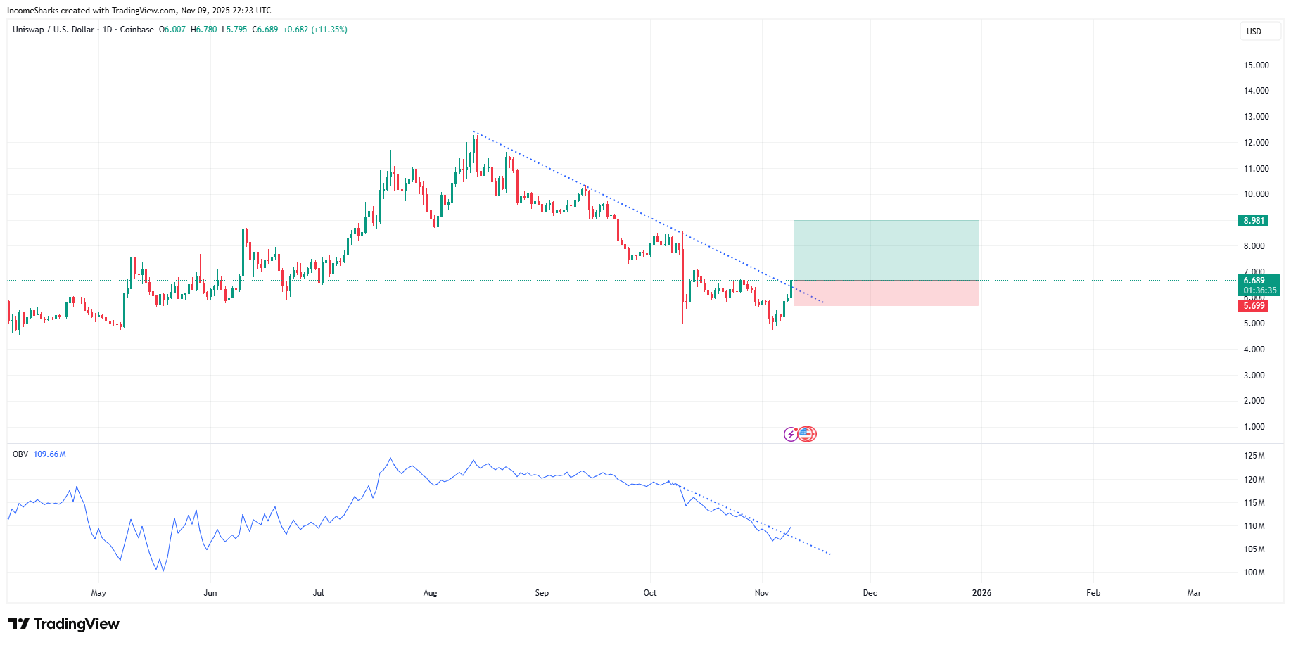 $UNI (new) - This is more of a purely TA play right now as it’s showing the same setup that a lot of other altcoins have shown. You could probably find a pretty decent list of others with the same setup. But with this one I like the OBV breakout, the downtrend breakout, and it doesn’t feel like it’s already moved too much. Treating this as a 2:1 risk to reward setup. 15% stop loss, with 30% upside. Hopefully by next week we’ll have more clarity of these conditions.