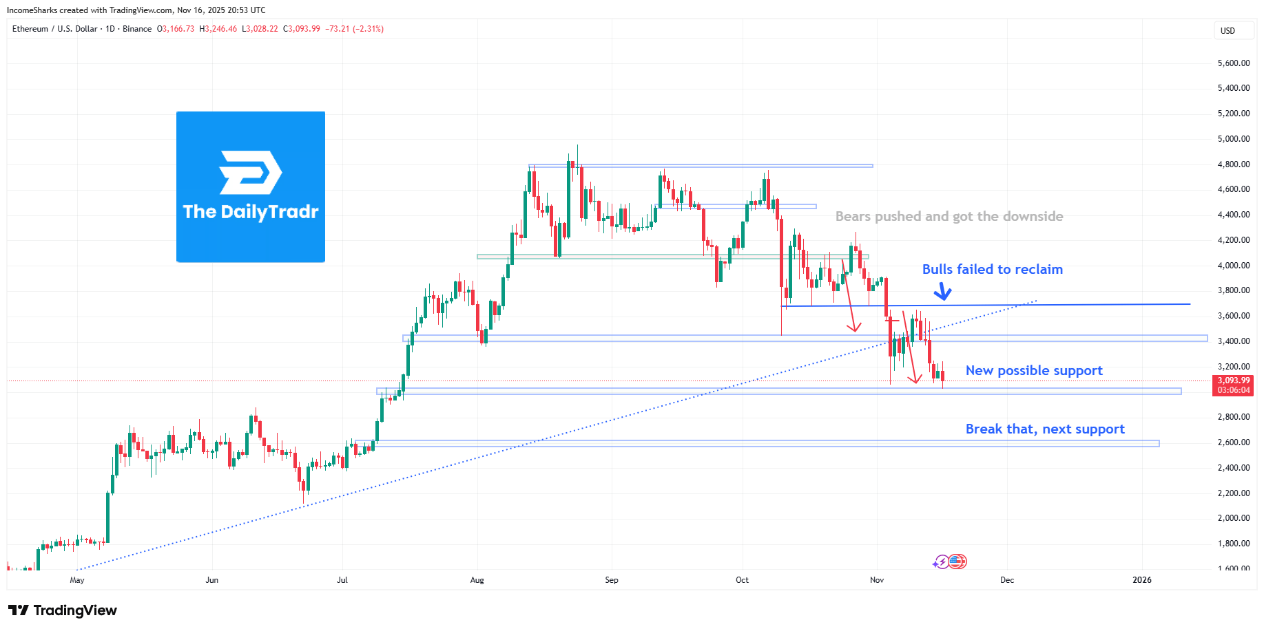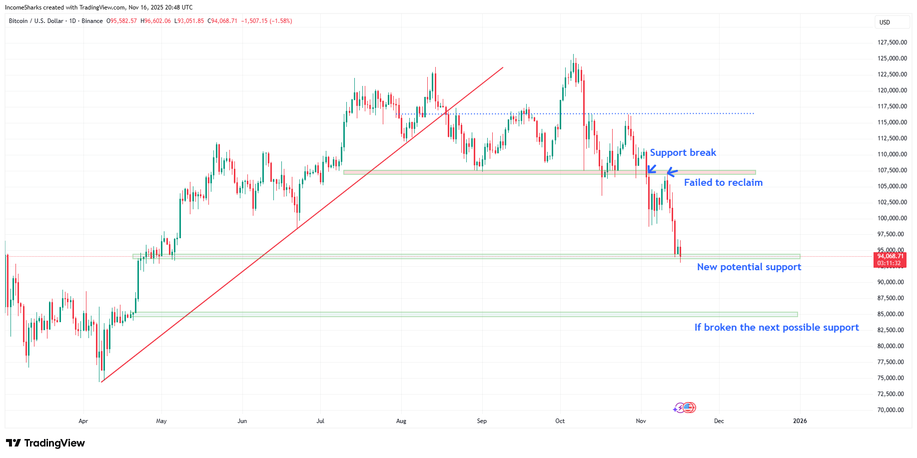 First time we’ve seen a candle close below the trendline which started in May