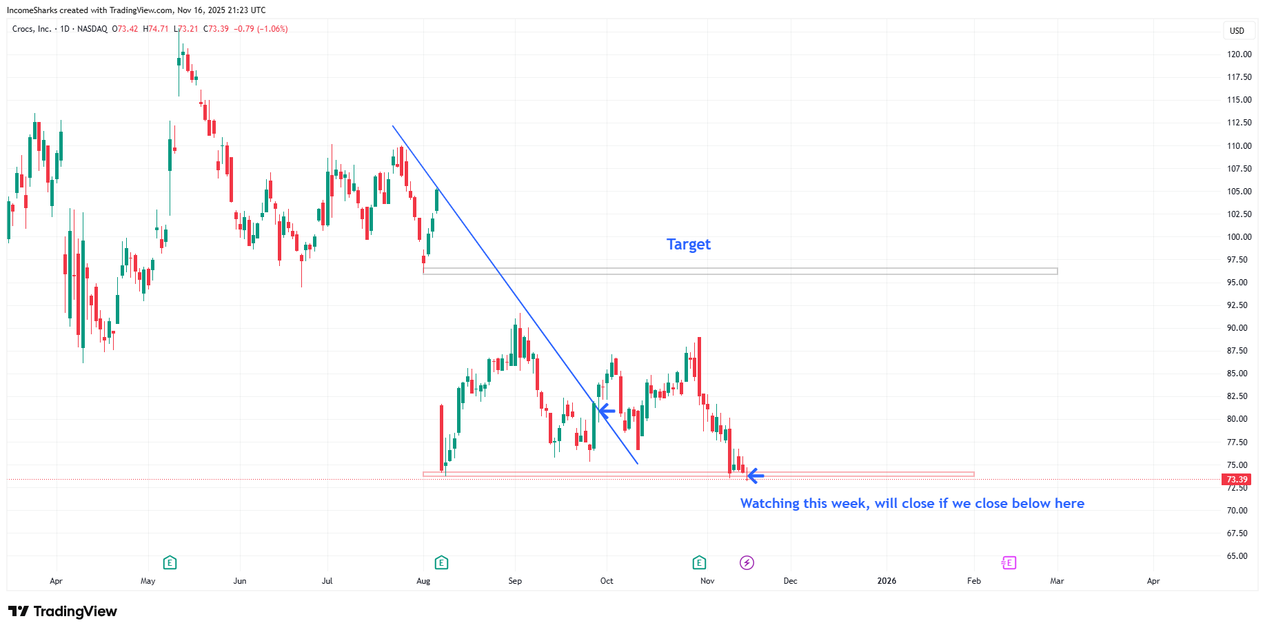 $CROX ( ▲ 0.12% ) (Crocs) - Still holding. This is probably the week where if it closes below the line I will cut for a loss.