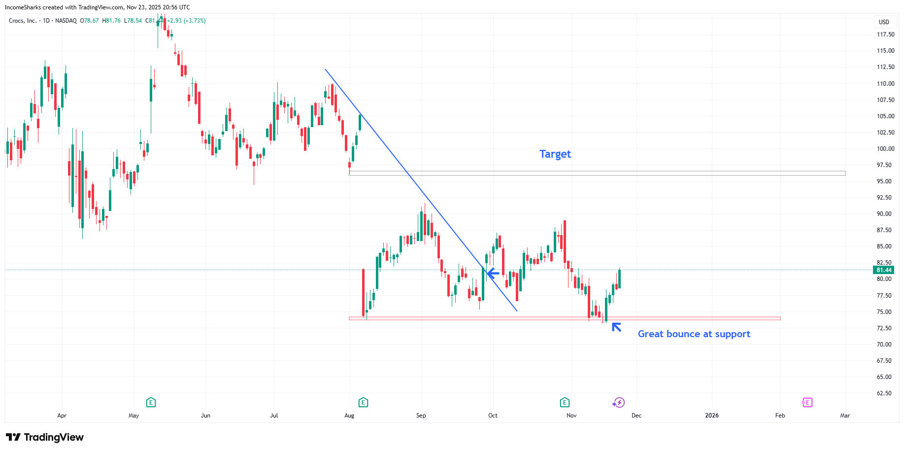 $CROX ( ▲ 0.12% ) (Crocs) - Great bounce at support, still holding and actually nice to see it back in profit.