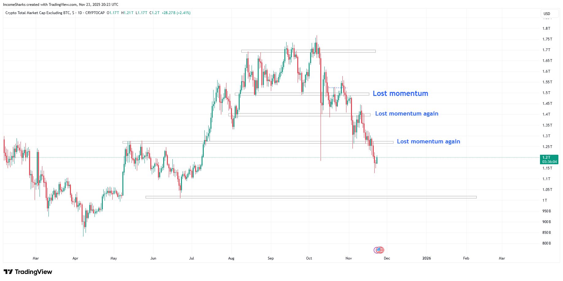 Another bad week for alts as Bitcoin, Ethereum, and Sol pushed lower causing another round of selling. There are still supports lower that could fill which mean we could see the entire altcoin marketcap get as low as 1 trillion. But at that point you would have to assume the risk to reward opportunity of buying might start to get really attractive.