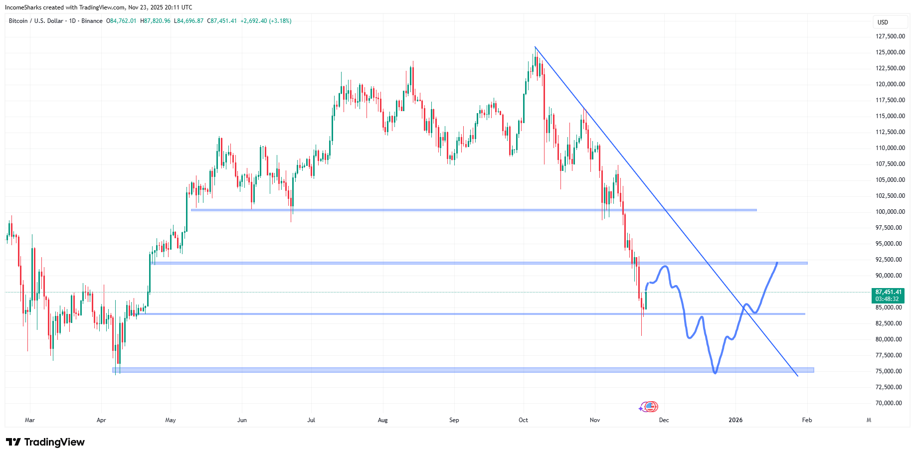 CHART: From last week we lost the support and found the lower one. The selling and sentiment doesn’t seem like it can’t get much worse so thinking we see something like this paly out below. Still think we break sub $80k but hopefully that’s short lived. It’s going to be much more difficult to get buyers to show up until we get structure or support established.