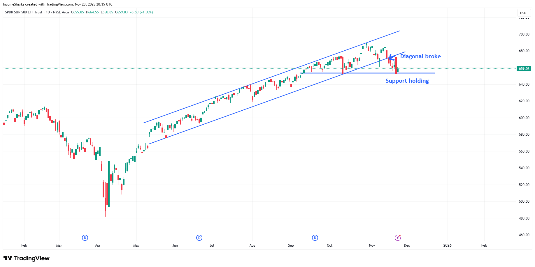 A lot of eyes were on $NVDA this week and they delivered big with earnings. Led to a huge market push overnight and in the morning that instantly got reversed and led to one of the larger sell off days all year. We saw unemployment numbers rise and saw fears of the fed no longer cutting rates in December (odds dropped to 20%). After that chaos towards the end of the week we saw a bounce on Friday as odds are back up to 70% of a fed rate cut. Market really trying to gain its footing again and although we broke the diagonal trend line the price is still holding up at a major horizontal support.