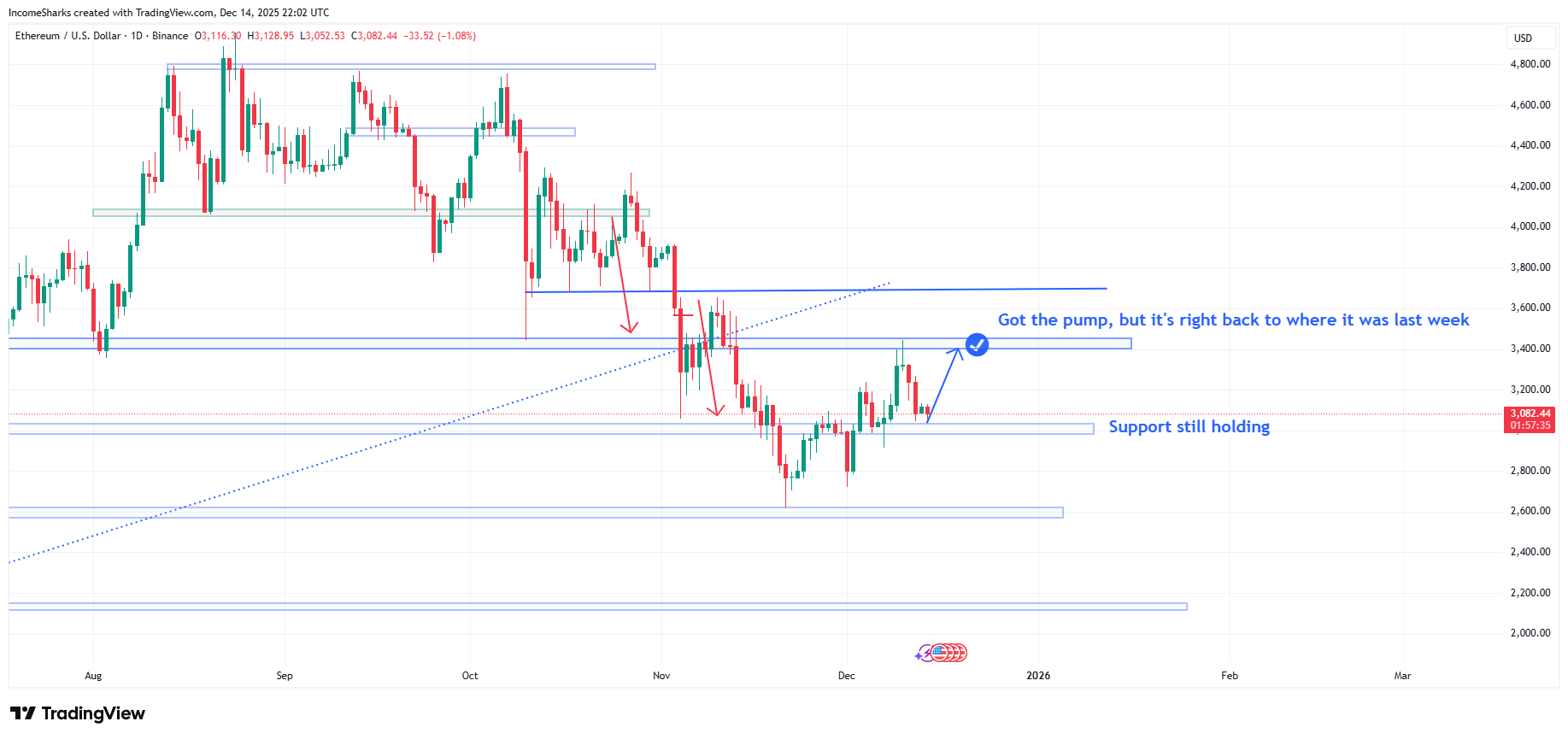 Prediction: We got the expected pump last week (arrow was the prediction). Unfortunately it has since fully retraced. I guess the good news is that it’s found support again and if we can pump back again it should finally take us higher and show a downtrend reversal. However, if this support loses it’ll be hard to see a scenario where the $2,600 support isn’t retested.