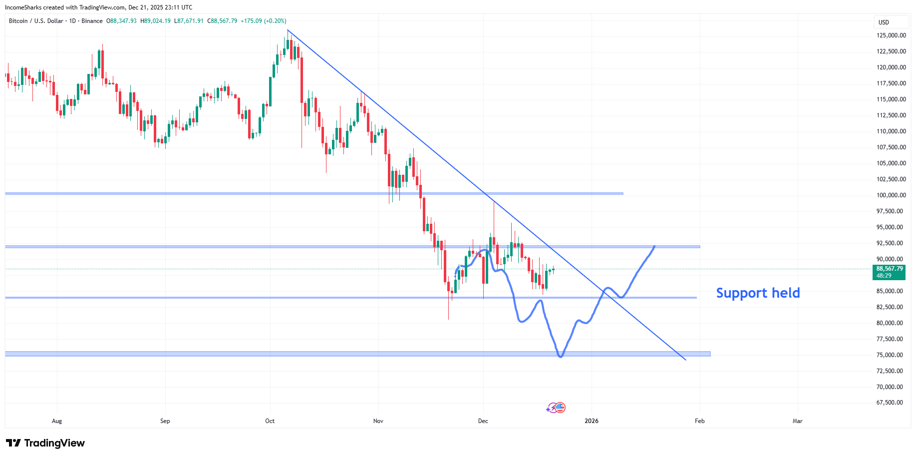 Down 2% from the last newsletter. Saw a deeper drop that has since recovered holding on to that $85,000 support.