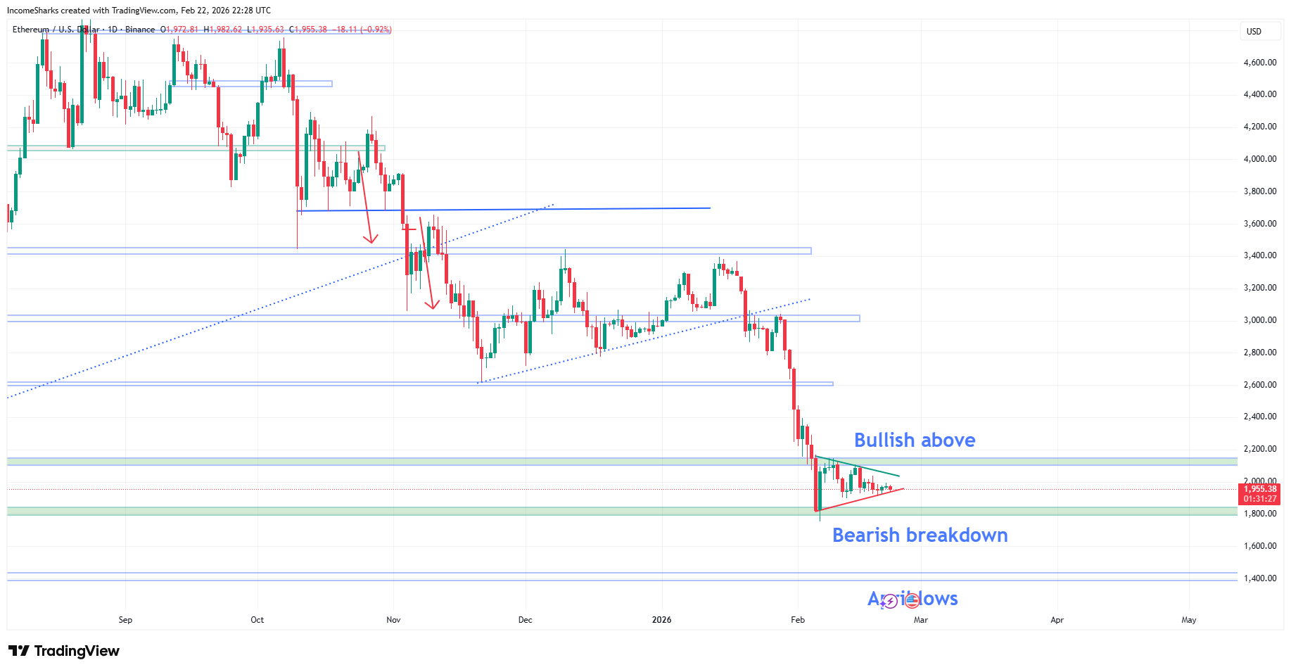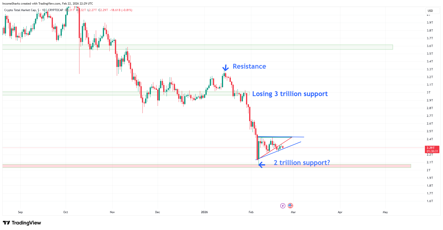 There’s going to be different ways to draw this up. Blue lines and red lines from last week could be valid. It’s struggling like it wants to spill downwards but we probably need another week to see if it’s making any more obvious moves. A reclaim back to 2.5 trillion wouldn’t be exciting for a rally, or another touch to 2 trillion might be a decent way to form a double bottom.