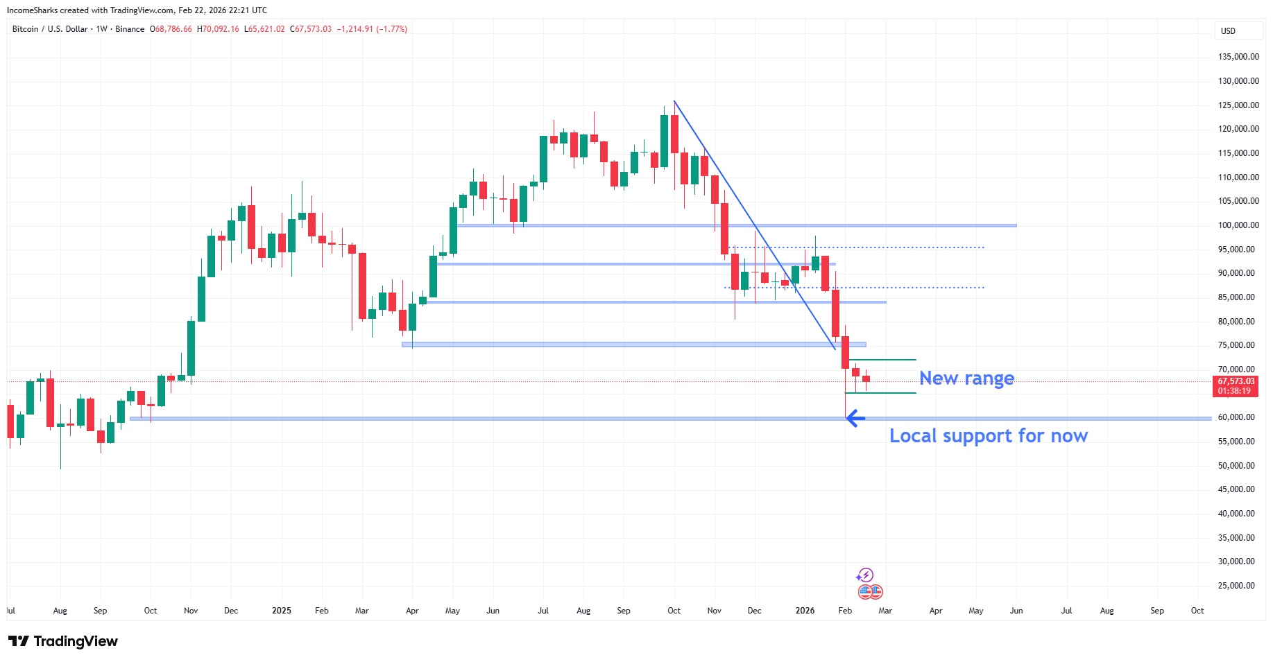 Honestly not much to report. Stayed in the range as expected, about as much downside as upside as expected, and I’d be shocked to see next week be any different. The Clarity Act bill could help with a little relief but then if stocks react to negative news I’m sure we’ll see some more selling. At this point sellers have to be pretty exhausted so not really worth shorting or selling at this point if still holding, and not enough price action/support established to jump back in if without exposure.