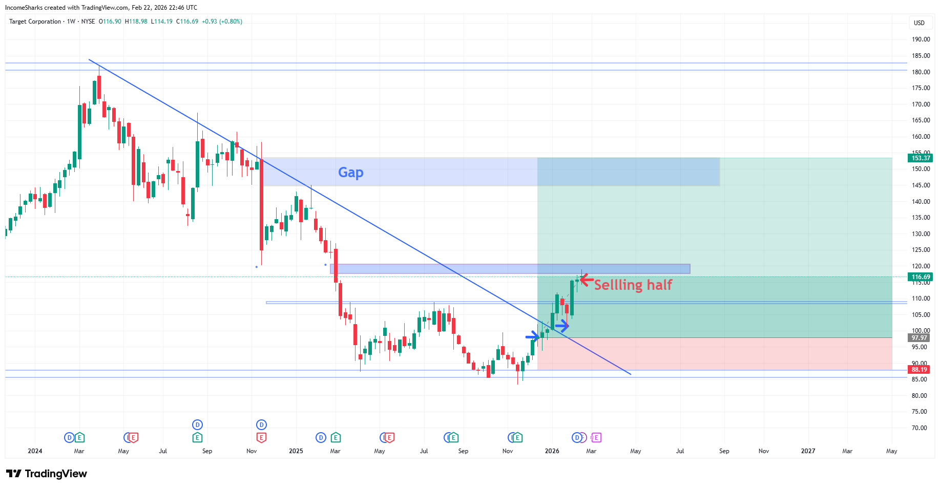Took some profits on Target this week. First Blue Box is essentially the first TP zone, second one is the ideal TP zone if we can find a way to clear the $120 range. If you want updates during the week they are shared on usa.