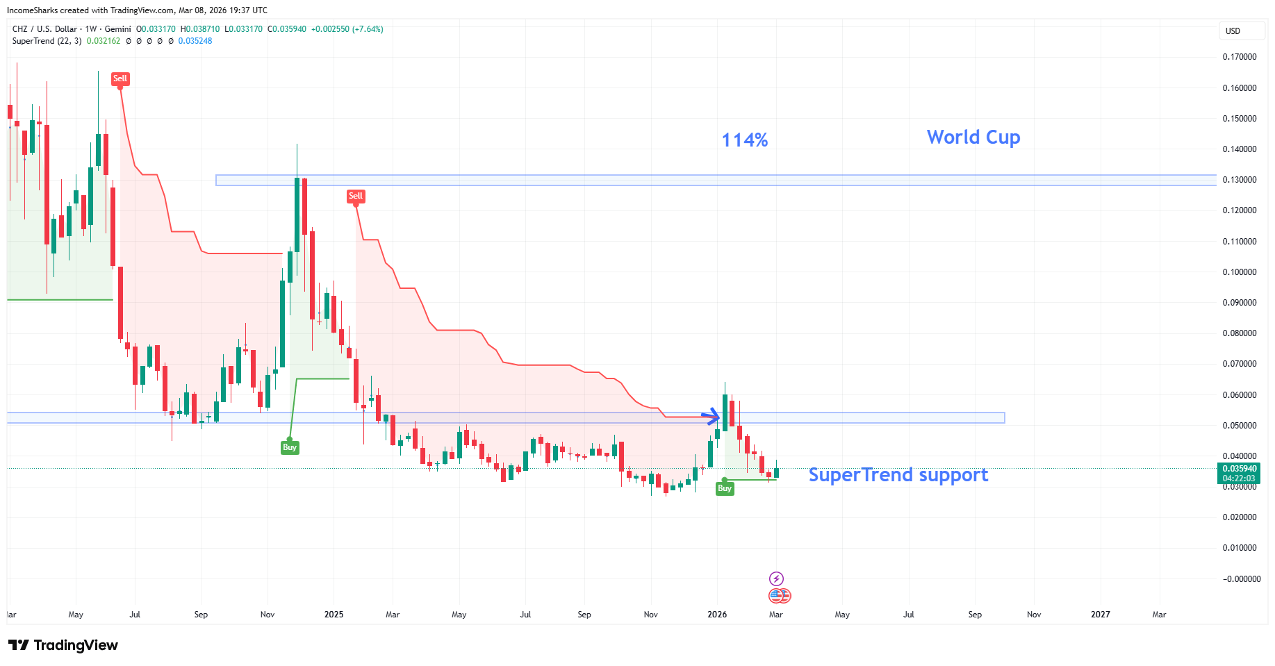 $CHZ - SuperTrend holding on the weekly. Just waiting for crypto conditions to improve and to see this snap back quicker than the other ones.