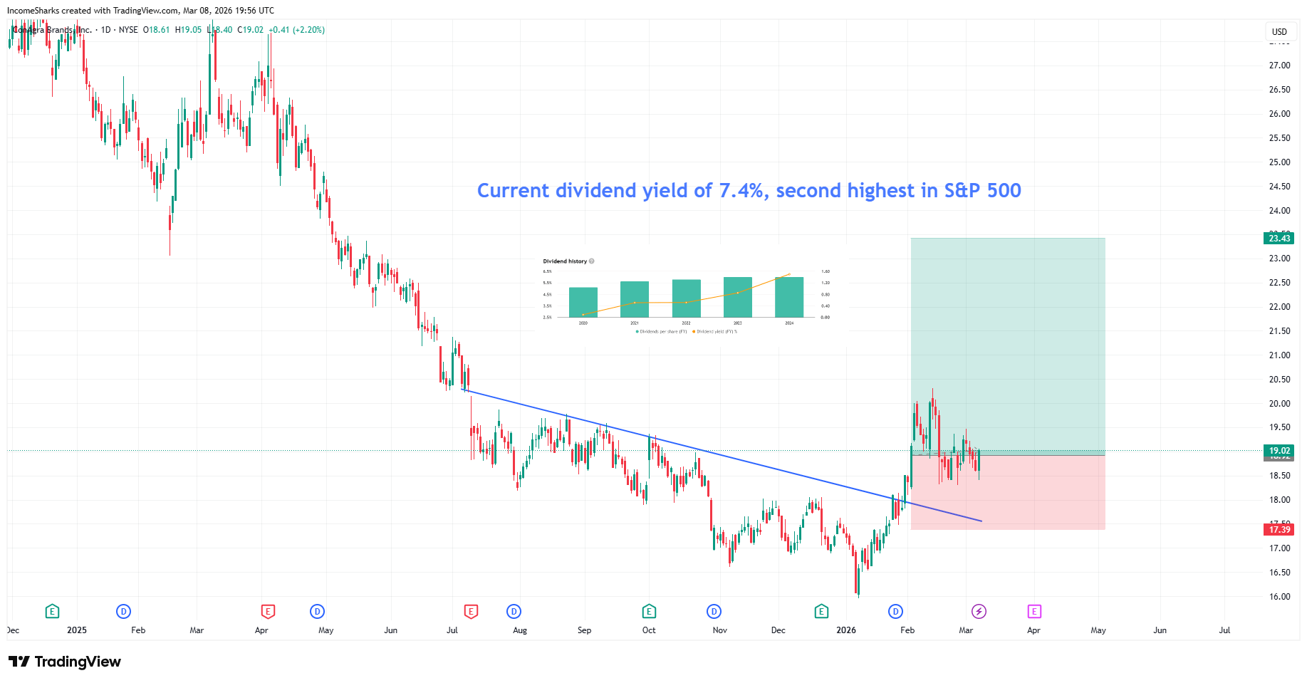 Boring frozen and packaged foods play with good dividends. Downtrend breakout and if conditions remain unstable at least a boring stable dividend play based on food has a chance to keep trending up.