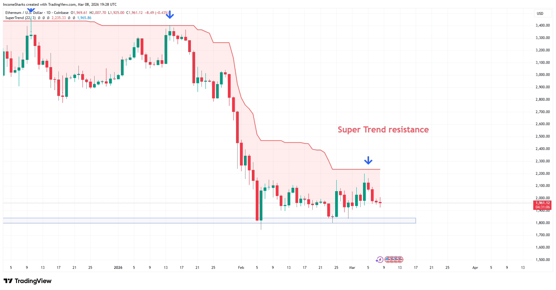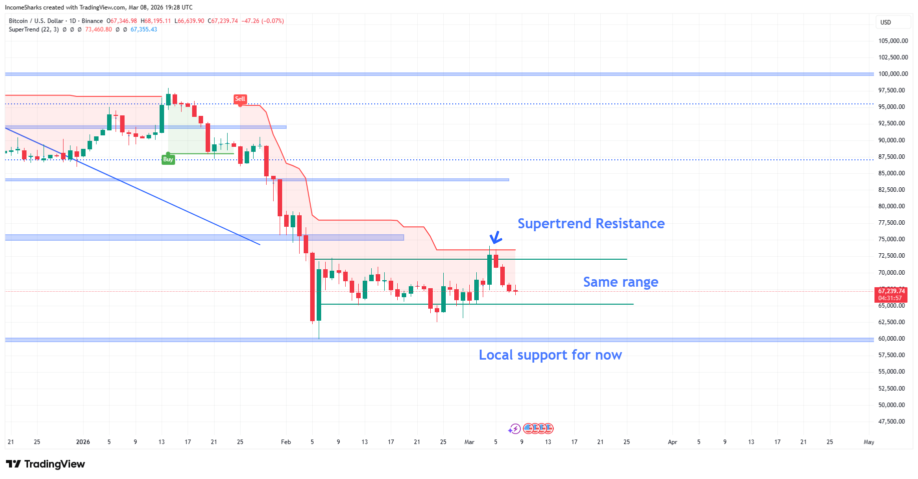 Still stuck in the same range with one day where it looked like there was some hope. Clean Supertrend rejection (red line) and back in the range we continue.