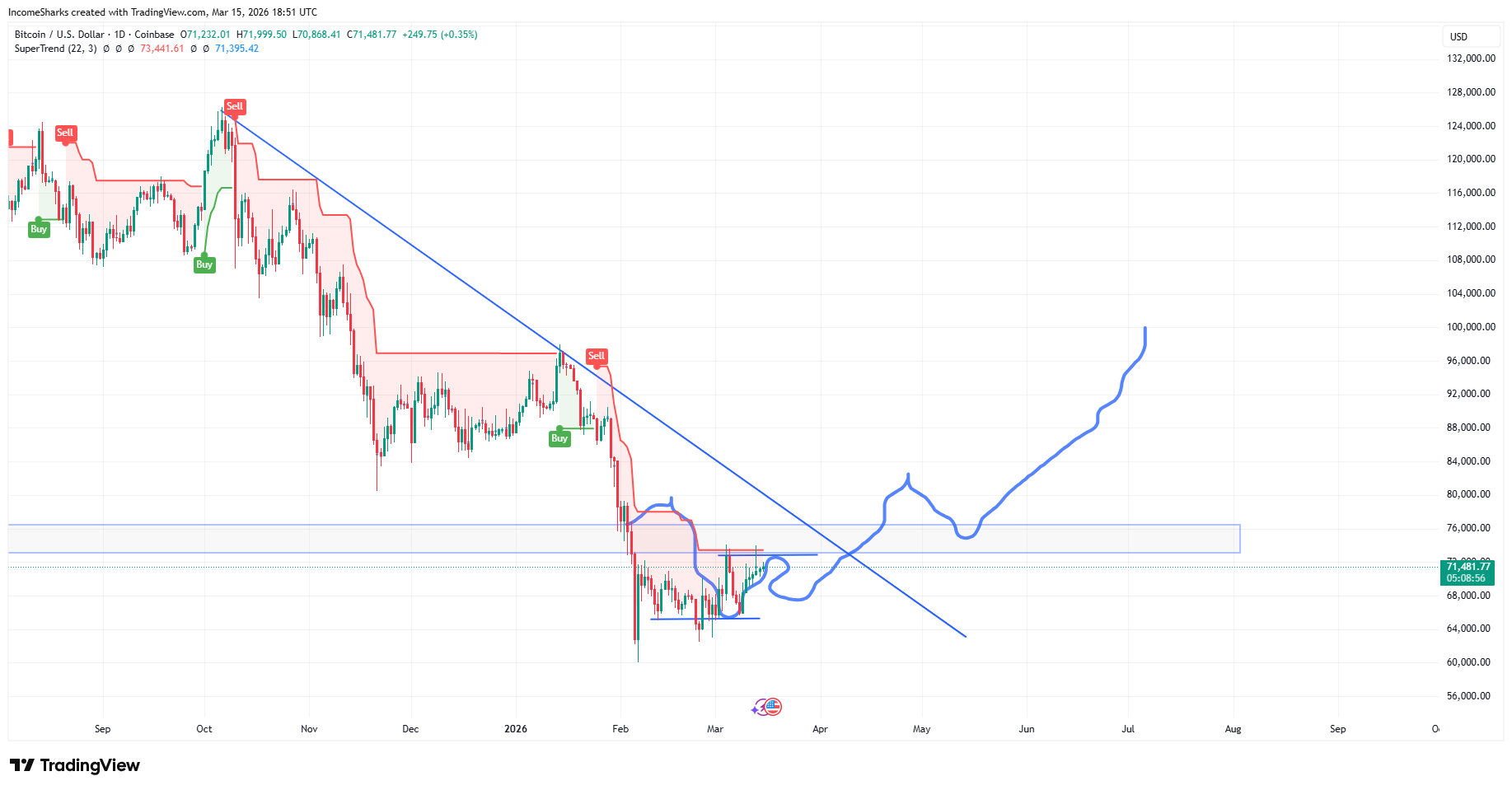 The squiggles continue to show strength, OBV finally pushing up, and the next milestone now is to flip that SuperTrend bullish. That’s where I start to get excited again. Strong weekly candle helps the chances of Bitcoin finishing the month of March green.