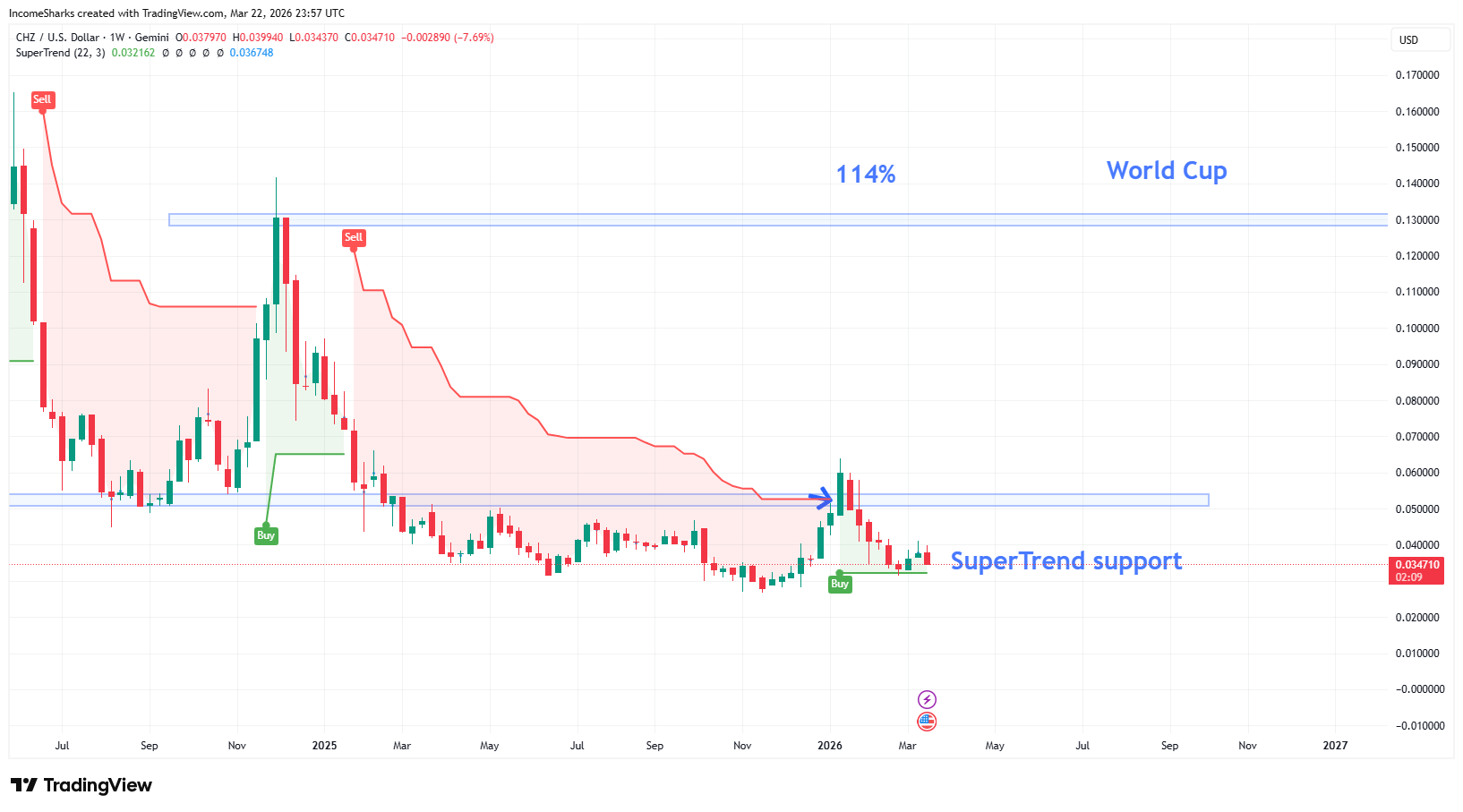 $CHZ - Still holding Weekly supertrend support, still just waiting for crypto to show life and probably keep it on a short leash now.