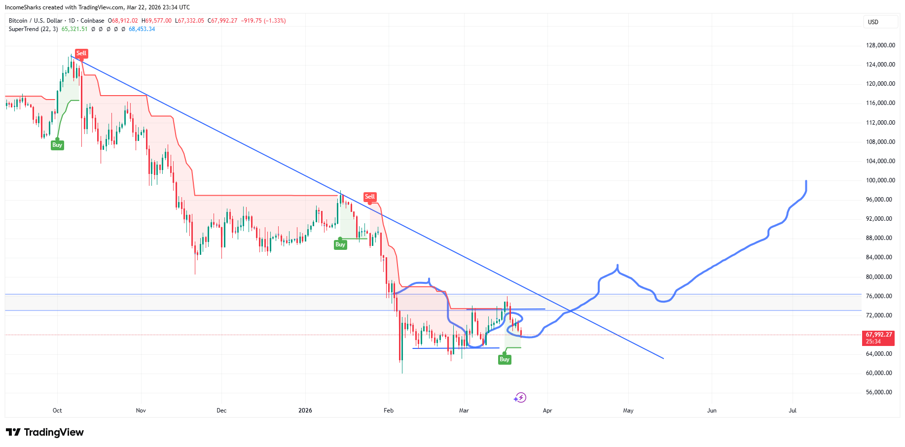 Had a nice breakout and getting a pullback. SuperTrend still bullish and now back in the channel with a chance for upside still. I would say though that if the SuperTrend flips bearish again it’ll be hard to argue we don’t see the April lows get re-retested.